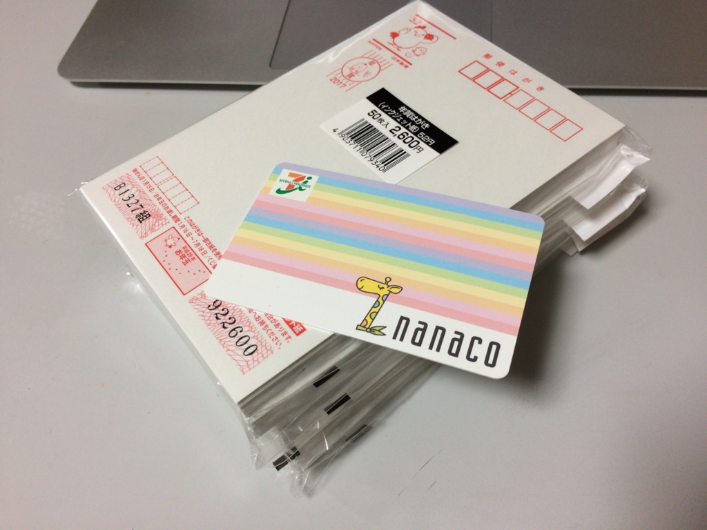 2016-12-20 年賀状 BLOG Twitter Google Pocket さて年賀状。 思い立って切手ショップで注文しようとしたら遅かった。 24日までの配達分は15日注文まで。 切手ショップお知らせ で、近所の金券ショップをあたったのだがどこも現金決済のみ。 カードで買いたいのだ。 で、近所のコンビニに行ったら大量在庫していた。 nanacoにクレジットチャージして無事購入。 こういう手があったのね。